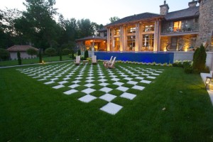 Surrounding the pool and creating the large terraces, is hand cut St. Marc in a brick pattern. This surface leads into the outdoor kitchen and pool house. Stepping down from the large upper terrace there is a checkerboard pattern of grass and stone, where there is more seating for those who want to enjoy the lake and all the while hear the sound of the pool water cascading down. What wonderful sight and sound!Want to see more projects? Head over to our main site.